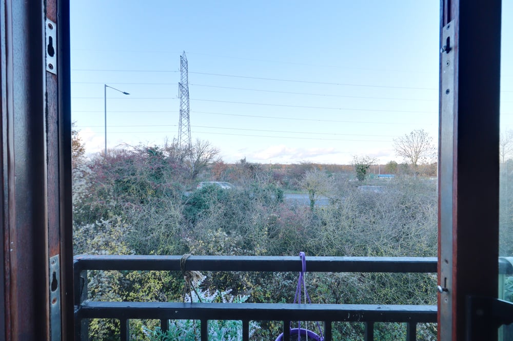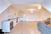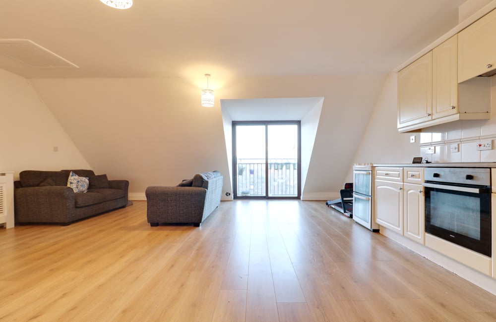 6.81m x 5.89m (22' 4" x 19' 4") (max). Hardwood framed double glazed sliding door to side opening to Juliet balcony, electric heater, a range of matching wall and base units, laminated work surfaces, one and a half bowl inset sink & drainer with mixer tap, integrated oven, four ring electric hob, space and plumbing for washing machine, space for freestanding fridge freezer, tiled splashbacks, laminate flooring, stairs to ground floor.