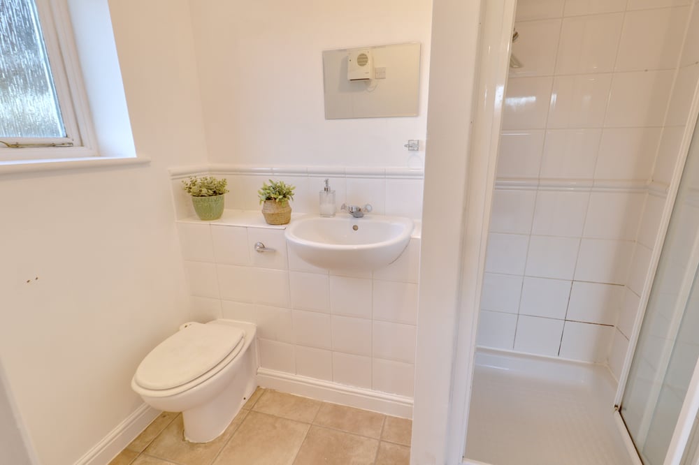 2.1m x 1.5m (6' 11" x 4' 11"). Obscure double glazed window to rear, low-level flush WC, hand wash basin set on tiled surface, shower cubicle, part tiled walls, laminate flooring.