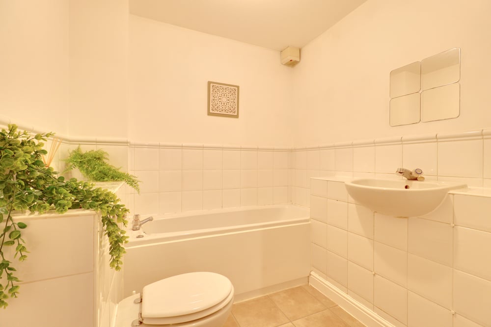 2.09m x 2.09m (6' 10" x 6' 10"). Low-level flush WC, panel bath, hand wash basin set on tiled surface, part tiled walls, laminate flooring.