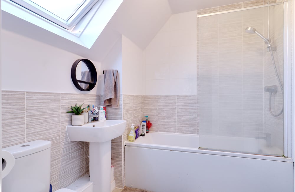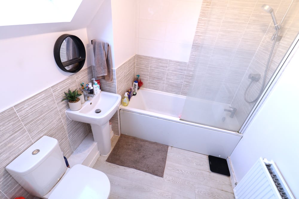 2.14m x 2.01m (7' 0" x 6' 7") Skylight window to rear ceiling, low level flush WC, panelled bath, shower, hand wash basin, radiator, part tiled walls, luxury vinyl flooring.