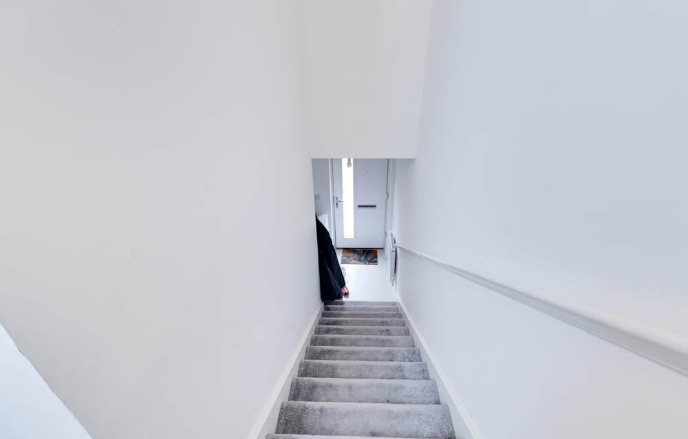 Radiator, wall mounted fuse box, luxury vinyl flooring, carpeted stairs to first floor.