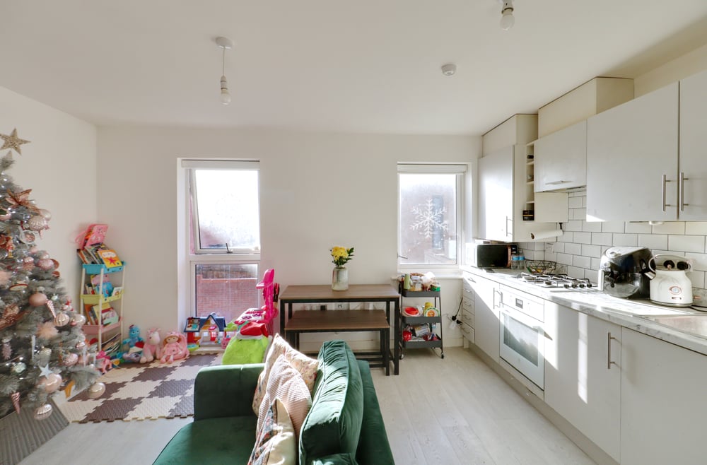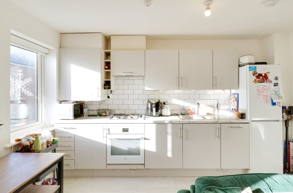 4.53m x 4.05m (14' 10" x 13' 3") > 3.65m (12' 0") Kitchen area; double glazed window to front, a range of matching wall and base units, marble effect laminate worksurfaces, one and a half bowl inset sink drainer with mixer tap, integrated oven, integrated dishwasher, integrated washing machine, space for freestanding fridge freezer, laminate splashbacks, tiled walls, luxury vinyl flooring.
