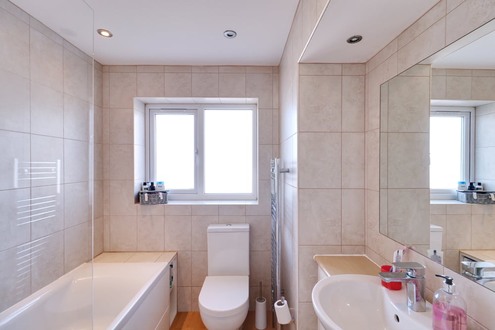 Inset spotlights to ceiling, obscure double glazed windows to rear, low level flush WC, panelled bath, shower, hand wash basin set on a range of base units on a laminate surface, chrome hand towel radiator, tiled walls, laminate flooring.