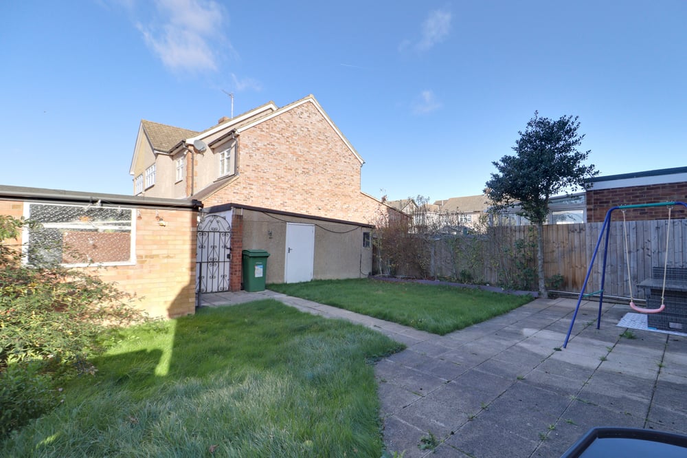 Approximately 34' x 31' Part paved and part laid to lawn, brick shed, access to front via timber gate, detached garage to rear.
