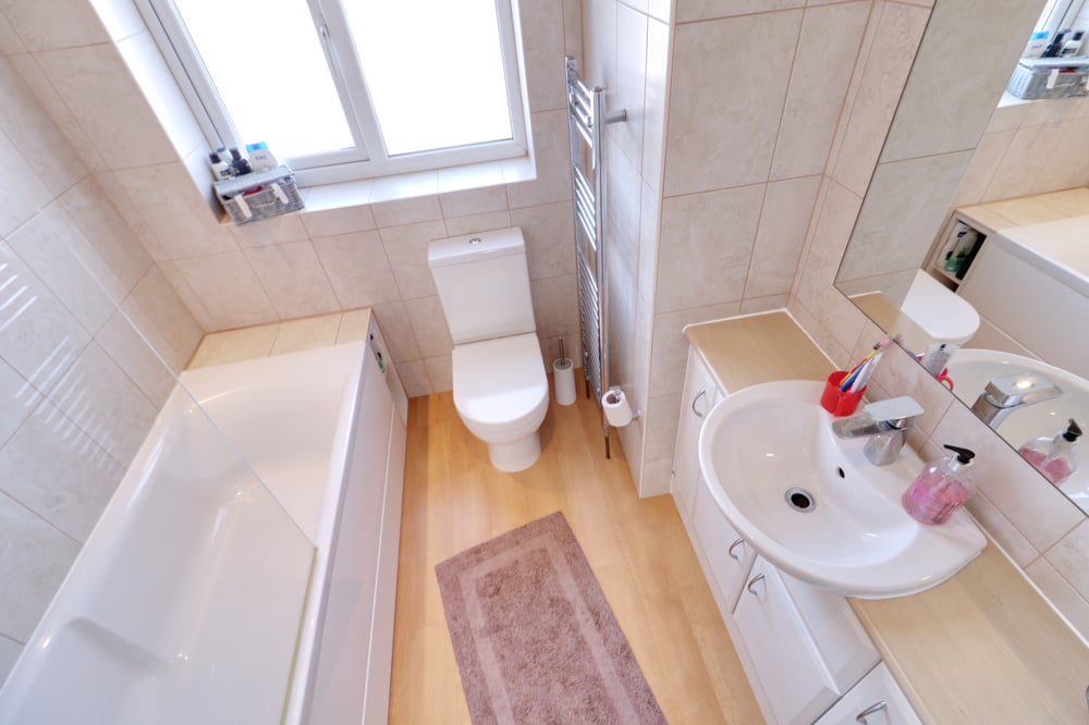 Obscure double glazed windows to side, low level flush WC, hand wash basin with tiled splashback set on a base unit, chrome hand towel radiator, Karndean flooring.