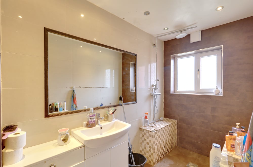 3.37m x 1.52m (11' 1" x 5' 0") Inset spotlights to ceiling, obscure double glazed windows to front, low-level flush WC, hand wash basin set on base unit, rainfall shower cubicle, tiled walls, tiled flooring.