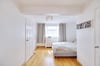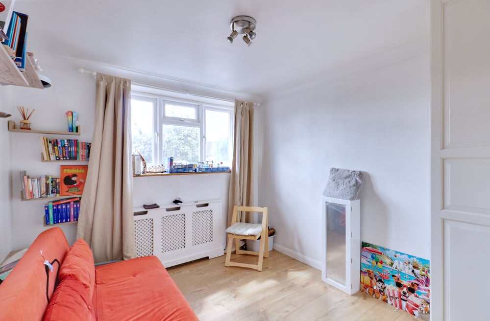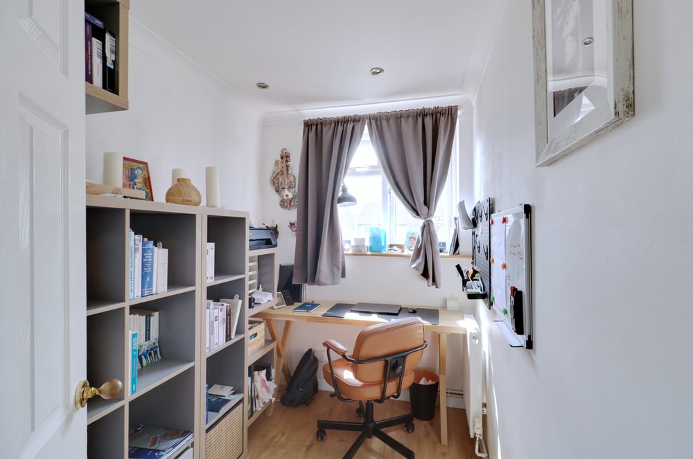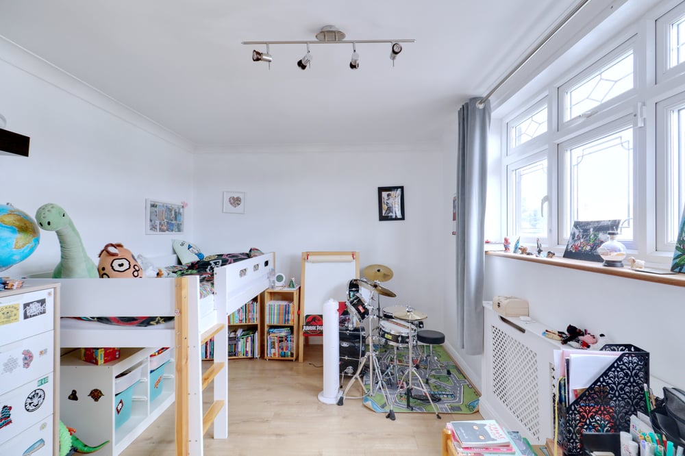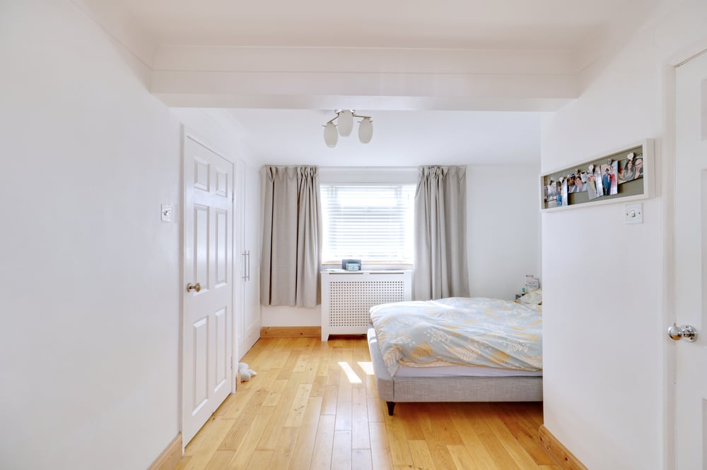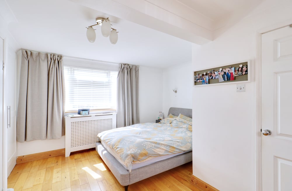 4.95m x 4.54m (into fitted wardrobe) > 2.25m (16' 3" x 14' 11" > 7' 5"). Skylight window with blackout blind to front ceiling, double glazed windows to rear, radiator, fitted wardrobes, storage in eaves to front, hardwood flooring.
