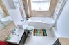 2.84m x 1.95m (9' 4" x 6' 5"). Obscure double glazed windows to side, P-shaped panelled bath, shower, low level flush WC, hand wash basin set on base unit, part tiled walls, tiled flooring.