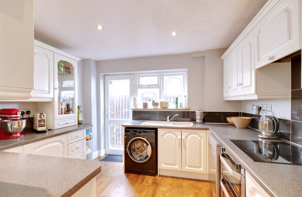 3.34m x 2.79m (10' 11" x 9' 2"). Inset spotlights to ceiling, double glazed windows to side, a range of matching wall and base units, laminate work surfaces, one and a half bowl inset sink and drainer with mixer tap, integrated double oven, four ring electric hob, extractor hood, space and plumbing for washing machine and dishwasher, tiled and laminate splashbacks, hardwood flooring, uPVC framed double glazed single door to side opening to side with access to front and rear.