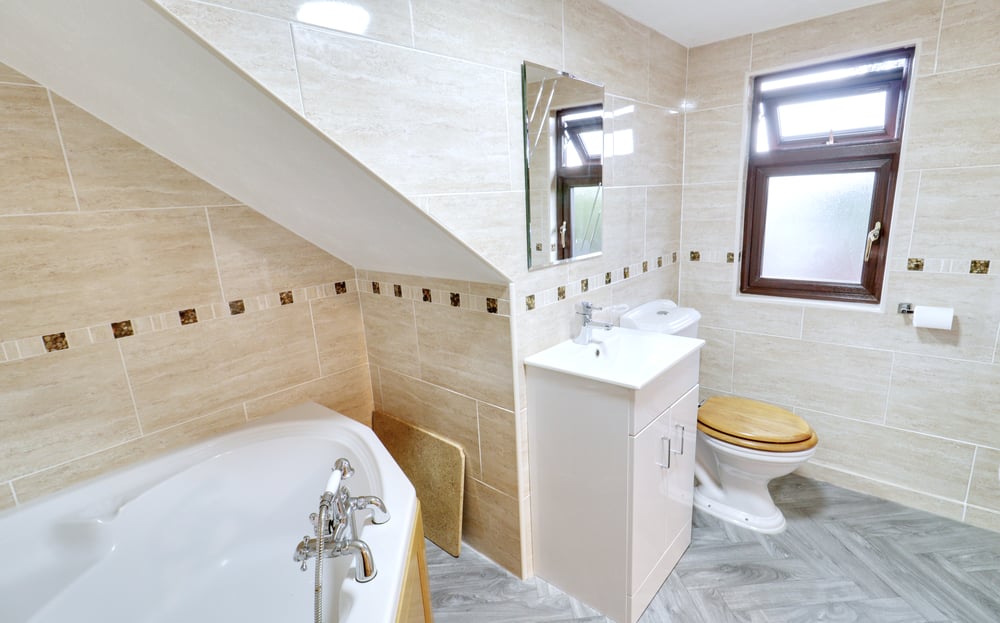2.27m (max) x 3.05m (7' 5" x 10' 0"). Obscure double glazed windows to rear, corner bath with shower attachment, low-level flush WC, hand wash basin set on base units, radiator with heated towel rail, tiled walls, vinyl flooring.
