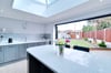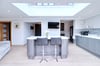 Dining area: Lantern skylight window (3m x 1.5m). Inset spotlights to ceiling, quartz worksurface with quartz splashback, one and a half bowl inset sink and drainer with mixer tap, a range of base units, space & plumbing for washing machine kitchen, Island with quartz worksurface over a range of base units, breakfast bar area, two radiators, porcelain tiled flooring, bi-folding doors to rear opening to rear garden.