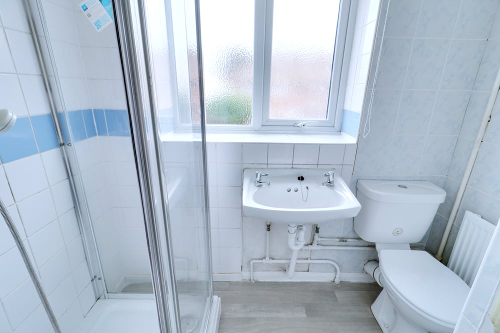 2.1m x 1.71m (max) (6' 11" x 5' 7"). Obscure double glazed windows to rear, low-level flush WC, hand wash basin, radiator, shower cubicle, tiled walls, vinyl flooring.