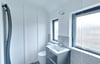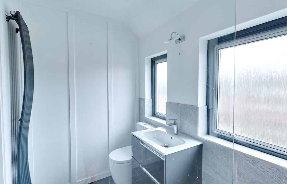 2.57m x 1.49m (8' 5" x 4' 11"). Double glazed windows to rear, inset spotlights to ceiling, low-level flush WC, hand wash basin set on drawer units, rainfall shower cubicle, modern gunmetal grey vertical radiator, part tiled walls, tiled flooring.