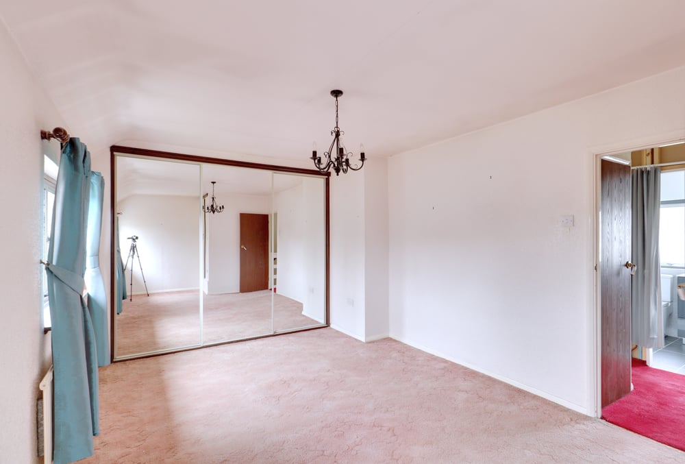 5.64m (into fitted wardrobe) x 3.3m (18' 6" x 10' 10") max. Double glazed leaded windows to front, radiator, built-in over-stairs storage cupboard, fitted wardrobe with sliding mirrored doors, fitted carpet.