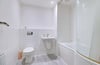 2.26m x 2.22m (7' 5" x 7' 3") Inset spotlights to ceiling, low level flush WC, hand wash basin, P-shaped panelled bath, shower, part tiled walls, radiator, vinyl flooring.