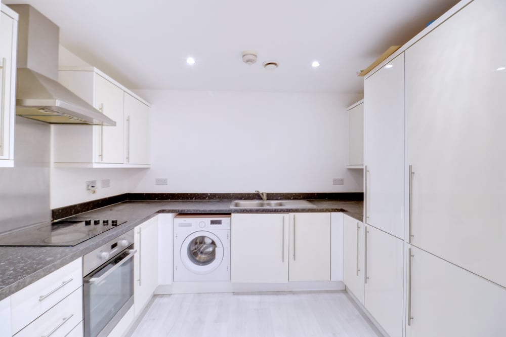 3.18m x 2.27m (10' 5" x 7' 5") Inset spotlights to ceiling, a range of matching wall and base units, laminate work surfaces, one and a half bowl inset sink and drainer with mixer tap, integrated oven, four ring electric hob, extractor hood, space and plumbing for washing machine, integrated fridge, integrated freezer, laminate splashbacks, laminate flooring.