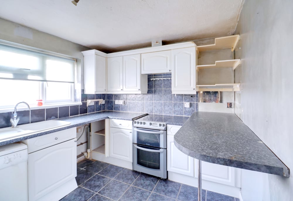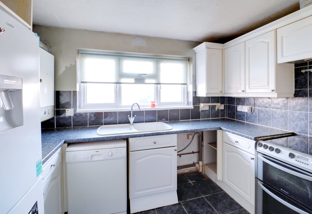 3.11m x 2.68m (10' 2" x 8' 10") Spotlight bar to ceiling, double glazed windows to rear, a range of matching wall and base units, laminate worksurfaces, inset sink and drainer with mixer tap, space for double cooker, space and plumbing for dishwasher and washing machine, space for freestanding fridge freezer, boiler, built-in shelves, breakfast bar area, part tiled walls, tiled flooring.