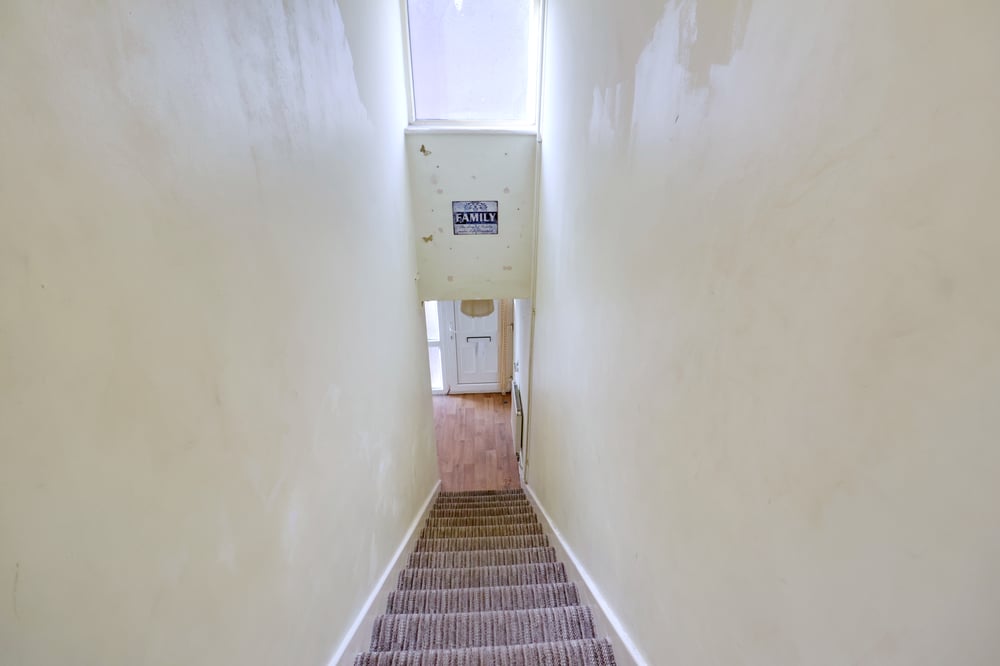 Radiator, obscure double glazed windows to front, vinyl flooring, carpeted stairs to: