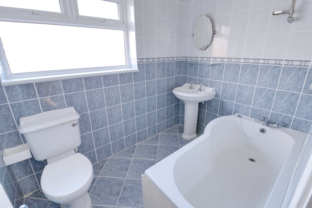2.33m x 1.68m (7' 8" x 5' 6") Inset spotlights to ceiling, obscure double glazed windows to rear, P-shaped panelled bath, shower, low level flush WC, hand wash basin, hand towel radiator, tiled walls, tiled flooring.