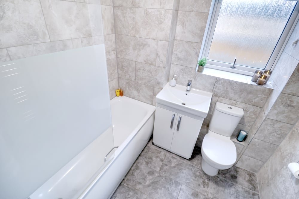 2.16m x 1.91m (7' 1" x 6' 3"). Obscure double glazed window to rear, low-level flush WC, hand wash basin set on base units, panelled bath with shower attachment, chrome hand towel radiator, tiled walls, tiled flooring.