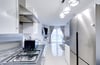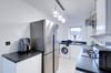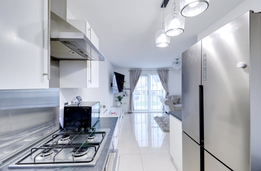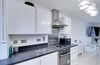 3.33m x 2.08m (10' 11" x 6' 10"). Double glazed window to rear, a range of matching wall and base units, laminate worksurfaces, one and a half bowl inset sink and drainer with mixer tap, space and plumbing for washing machine, integrated oven, four ring gas hob, extractor hood, space for American style fridge freezer, laminate splashbacks, porcelain tiled flooring.